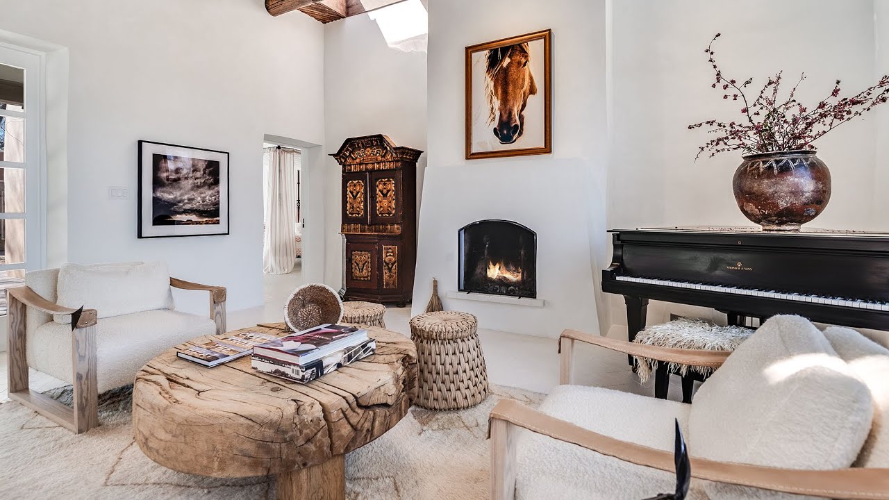 On the Acequia – This newly renovated ready adobe construction 2 bedroom 2.5 bath Doug Atwill designed home in the heart of the coveted Historic Eastside has been reimagined by a noted interior designer with a soft-contemporary palette. Light and bright with soaring ceilings, beautiful vigas, divided light windows throughout and painted brick floors. Enter through a stately foyer with skylights and french doors leading to a wisteria-covered portal with hand-laid porphyry stone. A spacious living room also accesses the garden with a custom steel pergola, stone fountain and kiva fireplace. An open-concept kitchen features custom white oak cabinetry, La Cornue range along with a glass front Sub Zero refrigerator, Waterworks fixtures and a vintage French glass-front cupboard. A cozy dining and seating area with kiva fireplace and Art TV complete this space. Two private bedrooms with fully renovated ensuite bathrooms and custom wood shutters. The sumptuous primary suite has a fireplace, sitting area, custom closet, and a spa-like bath with a Waterworks soaking tub, Toto toilet and glass-enclosed Chateau Domingue plaster shower. The second bedroom features custom white oak bookshelves and offers multi-flex space as a studio/office. Custom lighting and doors/hardware throughout, updated mechanical including radiant heating/cooling, tankless water heater, filtered water, landscaping, and sprinkler/drip system. All just a block away from Canyon Road galleries and restaurants.