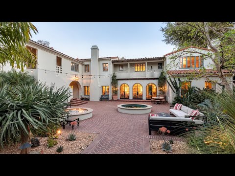 Quiet, privacy and peace are found in this elegant Roland Coate designed Monterey Colonial Revival estate built in 1928. Found on one of the most coveteted streets in South Pasadena it is minutes by car to downtown LA or a easy walk to the Gold Line making it convenient to dining, shopping and entertainment all over LA. Meticulously maintained and upgraded over the years it is an entertainer’s delight! Built on more than an acre of beautifully landscaped grounds, this property strikes the unusual balance between the grandeur of an estate and the warmth of a comfortable, relaxing family home. The updated floor plan and modern amenities remain true to its historic architecture. The main house features four upstairs en-suite bedrooms with an additional bedroom on the main level, each tastefully designed with impeccable finishes. The master bedroom offers a peaceful retreat with several sets of french doors, a balcony overlooking the yard, a dual-sided fireplace, two walk-in closets, and an ensuite bathroom with a walk-in shower and soaking tub. Formal rooms on the main level take you back to a less hurried time of hosting friends with the grand living room and library both centered on large fireplaces and the dining room featuring custom embroidered silk wallpaper. Off of the main hall there is an office with a beamed ceiling, built in cabinetry and a corner fireplace. The main family room opens into the gourmet kitchen which includes a more casual eat-in banquette area and opens through French doors to a peaceful front patio. A sunny loggia connects the interior to the exterior with three sets of dramatic Palladian steel doors that open to the main courtyard with a fountain and oversized fire-pit making outdoor events year round a pleasure. Up a set of exterior stairs and over a three car garage is a separate guest quarters which includes a bedroom, bathroom and a multi-purpose room currently used as a gym. A bluestone path lined with olive trees leads to an elegant pool and spa, a lighted north/south tennis court, bocce court, a lighted batting cage with pitching machine and a large stunning pool house. The pool house offers a covered pavilion with a fireplace, groin-vault ceiling and steel Palladian doors mirroring those in the loggia with a kitchenette, bathroom and a fully equipped barbeque/outdoor kitchen.
