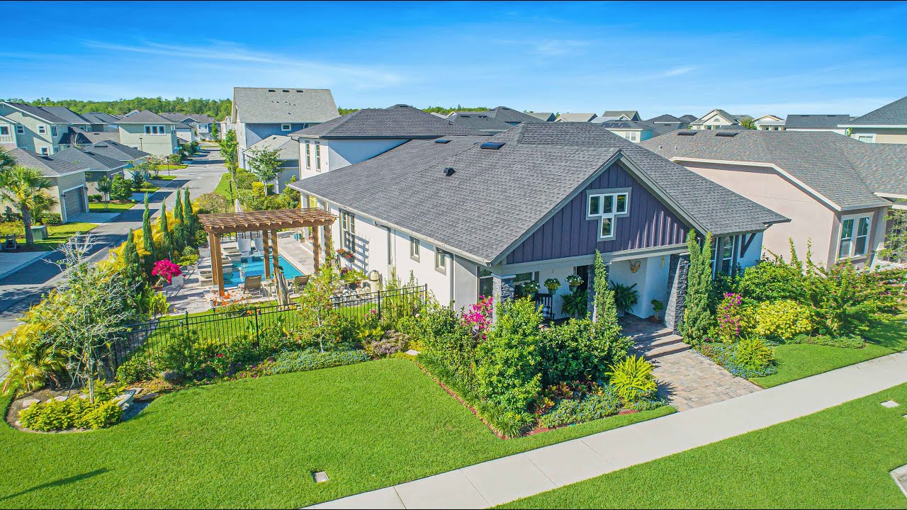 Charming with Classic Ambience! RARE ONE STORY, CORNER LOT, POOL, GARAGE SUITE! One of the most popular floor plans in Laureate Park, the Fogel II by Weekley Homes combines everything for a growing family. The main home has three bedrooms, two- and one-half bathrooms with an oversized three-car garage that hosts a one-bedroom en-suite that can be used in so many ways -home office, home school, in-law’s suite or guest overflow. Head inside this 2,971 sq ft beauty to the open floor plan with high vaulted ceilings and windows perfectly positioned to let in the sunlight, connecting the inside spaces with the outside. The home office greets you as you enter with French doors and views of the front covered porch. The Gourmet kitchen is the center of the home and overlooks the family room and a spacious breakfast nook. The kitchen has a center island with a breakfast bar, stainless steel appliances, a pantry, plus lots of sleek Mocha cabinets with a glossy subway tile backsplash that ties the room together making this home great for entertaining friends and family. The owner’s suite is private and spacious with a spa bathroom with a custom-designed walk-in closet w/ wall to wall shelving spaces, double sinks and a large, tiled shower. The laundry room conveniently connects from the main hall and the master bathroom and has cabinets with a sink. Two additional bedrooms, open retreat / flex room, full bathroom and a powder bath complete the living space. Upgrades include crown molding, trey ceiling, upgraded lighting fixtures, in-wall pest system and energy-efficient windows and more. Outside amazes! Travertine deck, sparkling saltwater pool with sun shelf, an outdoor kitchen and fire pits. The pergola is perfect for entertaining and enjoying dining alfresco. Fully fenced and landscaped with botanical gardens and lined with bougainvillea trees-imagine the beauty they will bring when blooming. So, whether you are hosting a few friends over for a weekend barbecue or you are simply spending an evening to yourself cozied up under the stars, this outdoor space will set the mood for the memories you wish to create. Laureate Park at Lake Nona has every amenity imaginable with a dog park, fitness center, aquatic center with a kid’s water park and lap pool and miles of walking and running paths. Great schools, shopping and Medical City minutes away. Make your appointment today-this home will be gone fast! One-year basic home warranty provided.