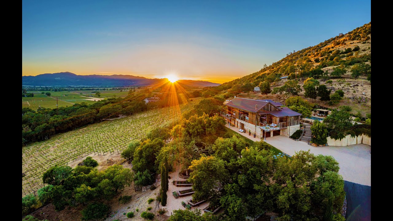 www.7774Silverado.com – Perfectly sited just 140 feet above the expansive verdant plain that is Napa Valley, this sophisticated modern barn style residence is uniquely gifted not only by its spectacular panoramic views, but also its easy direct access to “The Trail”. The land was cleverly sculpted to create a string of broad level areas where one can enjoy a variety of outdoor activities. The 6-bedroom home, inspired by French country barns, beautifully blends rustic elements such as Burgundy stone work and artisan matched barn wood, with modern design elements: custom glass balcony barriers and large scale Fleetwood doors. The floor plan, sleeping up to 20 people, was smartly designed for large scale entertaining, wonderful views from most every room, and optionality that works for a variety of living arrangements. The residence communicates seamlessly with the outdoors, its inviting pool with spa, bocce court, vegetable garden, and a vast array of venues for day and night-time dining and relaxation.