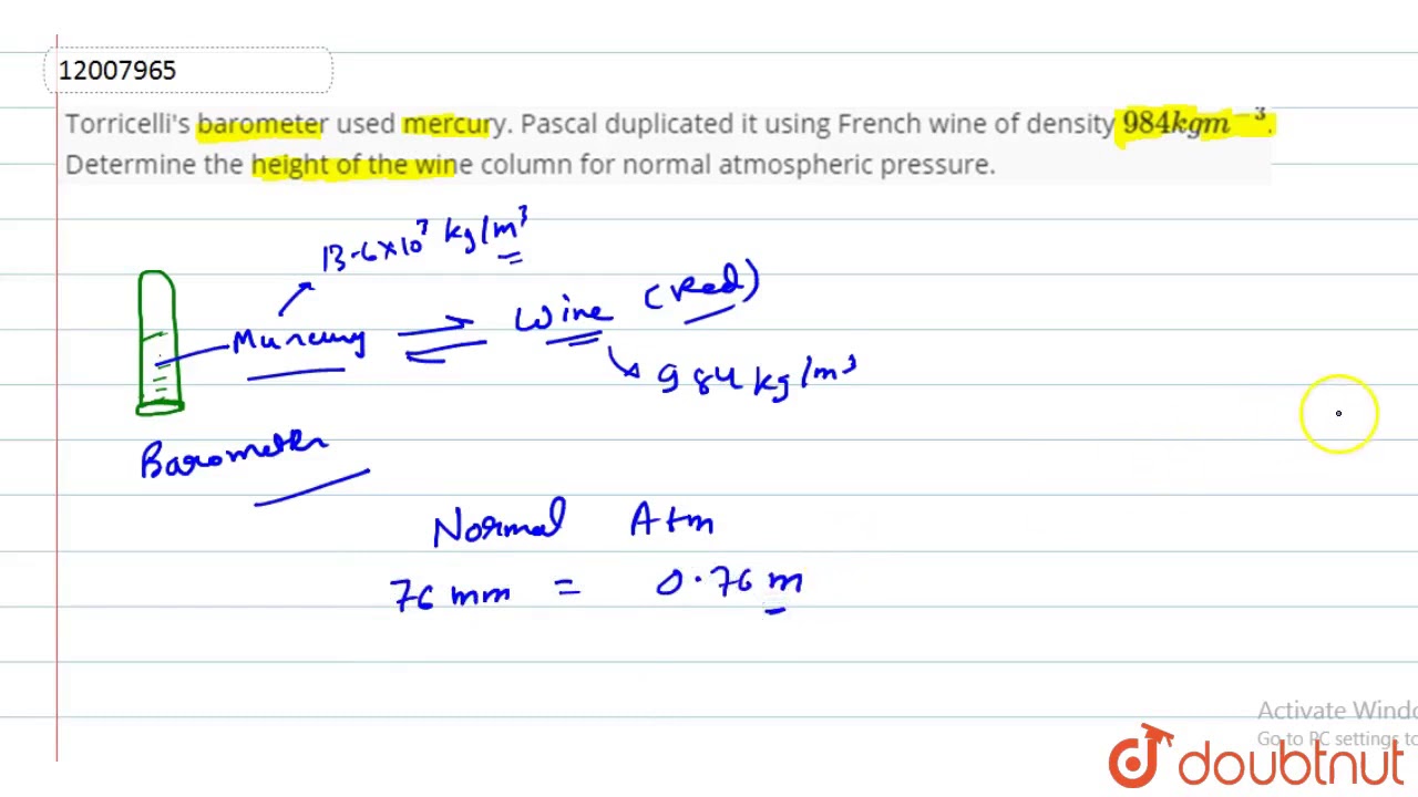 Torricelli’s barometer used mercury. Pascal duplicated it using French wine of density `984 kg m^(-3)`. Determine the height of the wine column for normal atmospheric pressure.