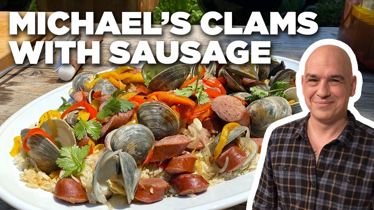 Michael throws clams, bell peppers and sausage in foil packets to steam on the grill, then serves them over rice pilaf for a perfect summery dinner.