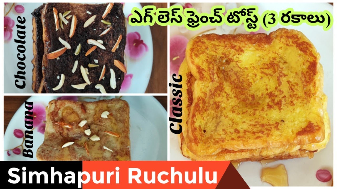 Today in Simhapuri Ruchulu, we prepare Eggless french toast recipe which is in 3 different flavors. Here we didnot use eggs for this Vegan french toast recipe we use custard powder for Eggless french toast. This custard french toast is very easy to prepare and quick recipe.