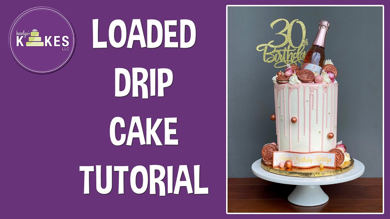How to Decorate a Drip Cake // In this cake decorating tutorial, I will show you how to make a pretty drip cake! You’ll learn how to make water ganache using candy melts and how to secure a mini wine bottle into the cake so it doesn’t fall over. You’ll also see how I paint rose gold onto the decorations.