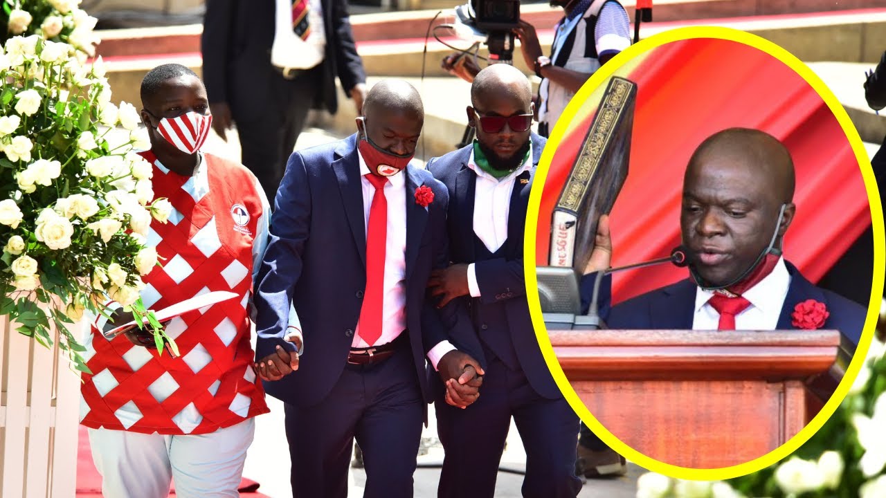 Segirinya who was recently released from incarceration at Kitalya Prison was escorted by family members who supported him on the stairs of the parliamentary building as he is still ailing and limping.