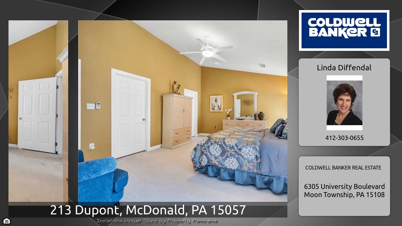 The Virtual Tour for the property at 213 Dupont, McDonald, PA 15057 listed for $393,500: Other homes for sale by Linda Diffendal of COLDWELL BANKER REAL ESTATE: Meticulously-maintained, 3,300 total sq. ft. home-with 6' extension on the back of house-is perfect for today's homeowners! Highlights include:1st fl office behind French doors, 1st fl laundry, finished basement, gourmet kitchen, stone gas fireplace, deck overlooking level, tree-lined backyard, hardwood in foyer, powder room, study, FR built-in speakers, upgraded trim/crown molding package & 3-car garage w/ample storage. LOVE the …
