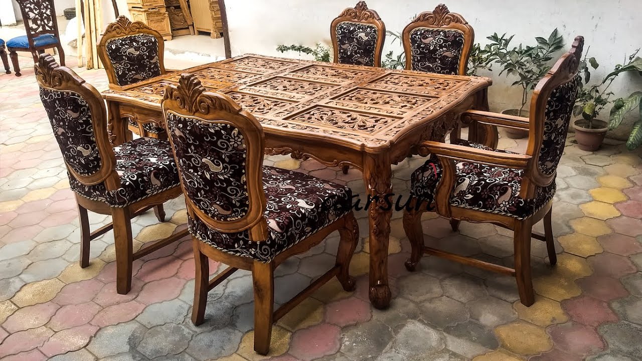 We talk about handcrafted 6 Seater Wooden dining set made from premium quality Teak wood by skilled artisans. A traditional style dining set that features fully carved dining table, and six chairs with Beautiful dark fabric. It is finished in natural polish for an ethnic appeal.