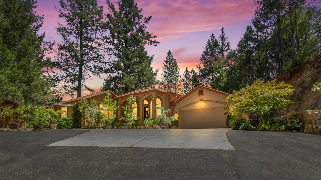 See the Property Website! :: This stunning single-story home has it all. Enjoy 3 acres of secluded woods and trees with private gate and driveway. Home has owned solar, well with water filtration system, 2 2,500-gallon water storage tanks, wired for high-speed internet, owned propane tank, seasonal pond, and drip water system. Custom build with 10′ and 14′ ceilings, travertine tile, radiant heated floors, berber carpet, crown molding throughout, granite and marble countertops, gas log marble fireplace, laundry room, and 2 master bedroom suites! Custom maple kitchen cabinets, pantry, convection oven, electric cooktop, and granite countertops are included in gourmet kitchen. Also includes marble columns, French country doors, oversized interior doors, and two walk in closets with 4 bedrooms and an office. Central heat and air with Canadian wood burning stove in great room allows for cozy winters and cool summers. There are dual panel windows and sliders throughout. Relax on expansive Trex deck or in sauna!