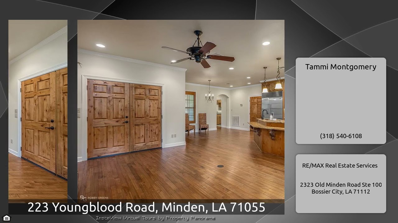 The Virtual Tour for the property at 223 Youngblood Road, Minden, LA 71055 listed for $525,000: Other homes for sale by Tammi Montgomery of RE/MAX Real Estate Services: Stunning 3 bedroom 2 bathroom home on 45 acres in Minden – granite throughout – ceramic tile and wood flooring with no carpet – wide open floor plan – gourmet kitchen with double French door ovens, SubZero fridge, and Wolf gas cooktop – whole home generator – 14 acres of 6 year old pine with hardwood mix for the rest – come and see this country-living gem today!!