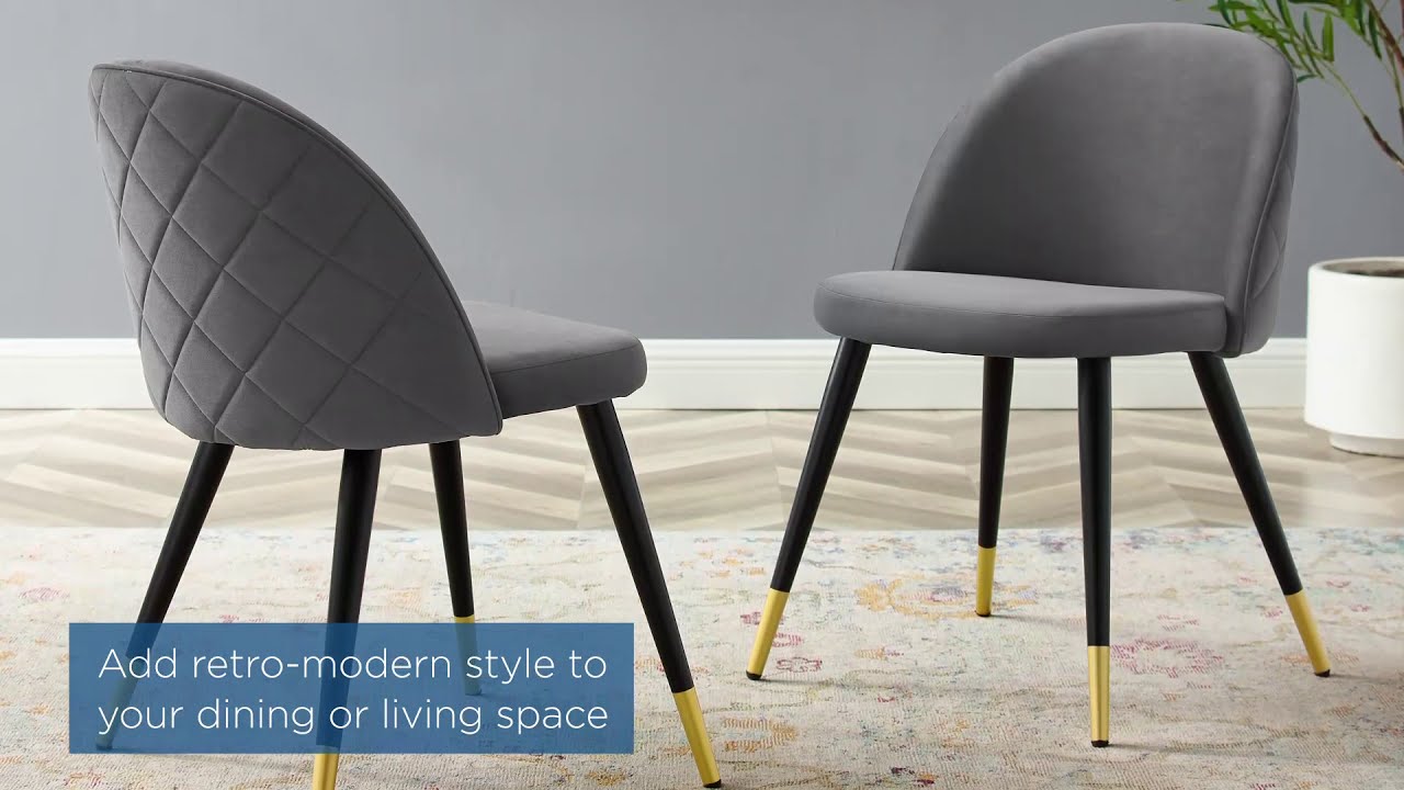 Inspire whimsical dining and stylish living with the Cordial Performance Velvet Dining Chairs Set of 2. Featuring a rounded silhouette with French piping detail and a diamond lattice pattern along the back, these upholstered chairs are covered in stain-resistant performance velvet and padded in dense foam to grant supportive comfort while dining or relaxing. A versatile addition to the dining room, kitchen, living room, home office, or entryway, this accent chair set rests atop black metal legs with gold accents and non-marking foot caps.