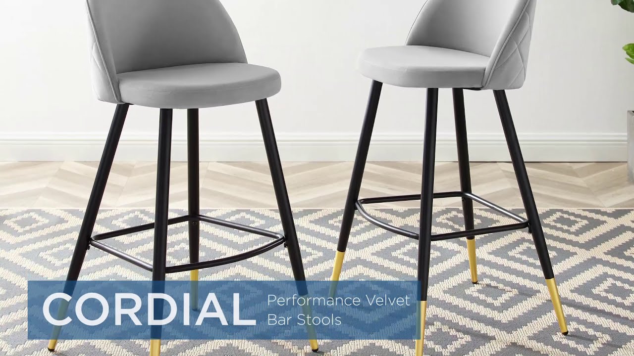 Inspire whimsical dining and functional style with the Cordial Performance Velvet Bar Stools. Featuring a rounded silhouette with French piping detail and a diamond lattice pattern along the back, these upholstered bar stools are covered in soft, stain-resistant performance velvet and padded in dense foam to grant supportive comfort while dining or relaxing. A versatile addition to a kitchen bar, or bar table, these velvet bar stools rest atop black metal legs with gold accents and non-marking foot caps. Bar Stool Weight Capacity: 300 lbs.