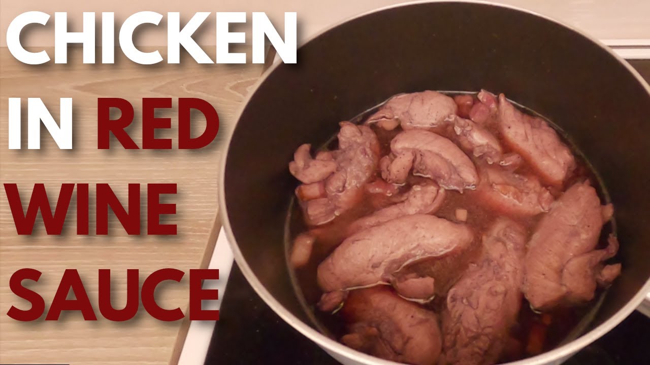 Recipe: fry the bacon pieces until they are cooked. In a pan, add the chicken, bacon, water, red wine, ginger, pepper and salt. Mix everything together, bring it to a boil and then let it simmer for around 20 minutes and serve. You can cook the sauce for longer to thicken it (adding breadcrumbs is another way of thickening it).