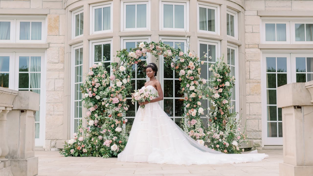 Nothing pairs like rococo and roses, and this French art wedding inspiration proves that and more in grandiose scenes of champagne, mauve, artichoke and tuscan red around The Olana. In an impressive collection of efforts from so many incredible local vendors, this styled shoot is giving radiant morning walk through a luxurious mansion garden, so much so that we could swear we were in 18th century France. A solo bride and romantic couple model throughout weddingscapes where every element was soft, petal-like and velvety with touches of metallic from rococo details. Décor from POSH Couture Rentals consisting of gold leaf goblets, beaded ivory damask table linens, rosy napkins and more set the standard for a luxe dining experience. Simultaneously, centerpieces from Lizzie Bee’s Flower Shoppe were comprised of Cappuccino, Quicksand, Sahara and Spray roses while butterfly ranunculus, hellebore and other blooms add diversity and texture to every artful installation. Each element is so unique while carrying the same Baroque undertones, like this exquisite two-tiered cake inspired by François Boucher’s The Triumph of Venus, 1745. With so many thoughtful inclusions, it was only fitting that videographer Alex Adkins Creative was on the scene to capture this French art wedding inspiration in full, moving detail.