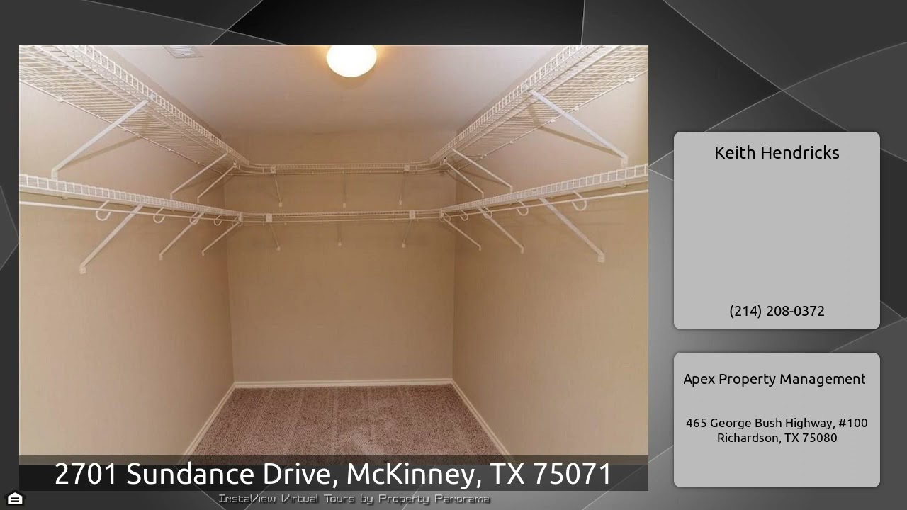 The Virtual Tour for the property at 2701 Sundance Drive, McKinney, TX 75071 listed for $2,175: Other homes for sale by Keith Hendricks of Apex Property Management: Updated with outstanding floor plan featuring 3 BR and separate office with French doors. Oversized living area with continuous tile floors open to large gourmet kitchen. The spacious master suite includes a sitting area and a bath with dual vanities, a garden tub, and separate shower. Extended cedar covered backyard patio perfect for entertaining leads to an impressively sized yard. This impressive home also offers a two car …