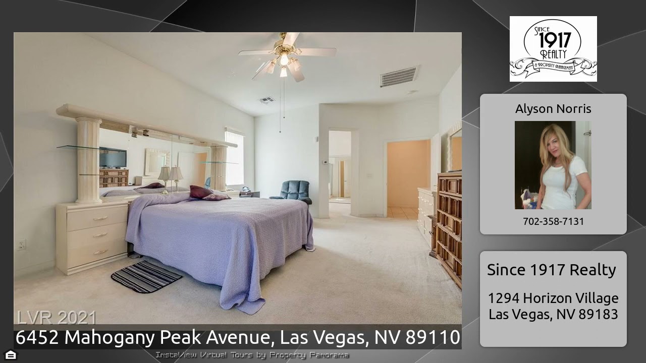 The Virtual Tour for the property at 6452 Mahogany Peak Avenue, Las Vegas, NV 89110 listed for $465,000: Other homes for sale by Alyson Norris of Since 1917 Realty: This Single Story Home Is Truly Remarkable*4 Large Bedrooms*3 Car Garage*Huge Self Contained Permitted Addition With Its Own Entry,Air Conditioner And Heater*Corian Countertops*Gourmet Kitchen With Double Ovens*Security Entrance With Courtyard*Upgraded French Doors In Front*Upgraded Range Top*New Artificial Turf In Back*Large Spa With A New Motor*Actual Sq. Footage Is 3283 Soon To Be Updated In Tax Records*Low Maintenance Desert …