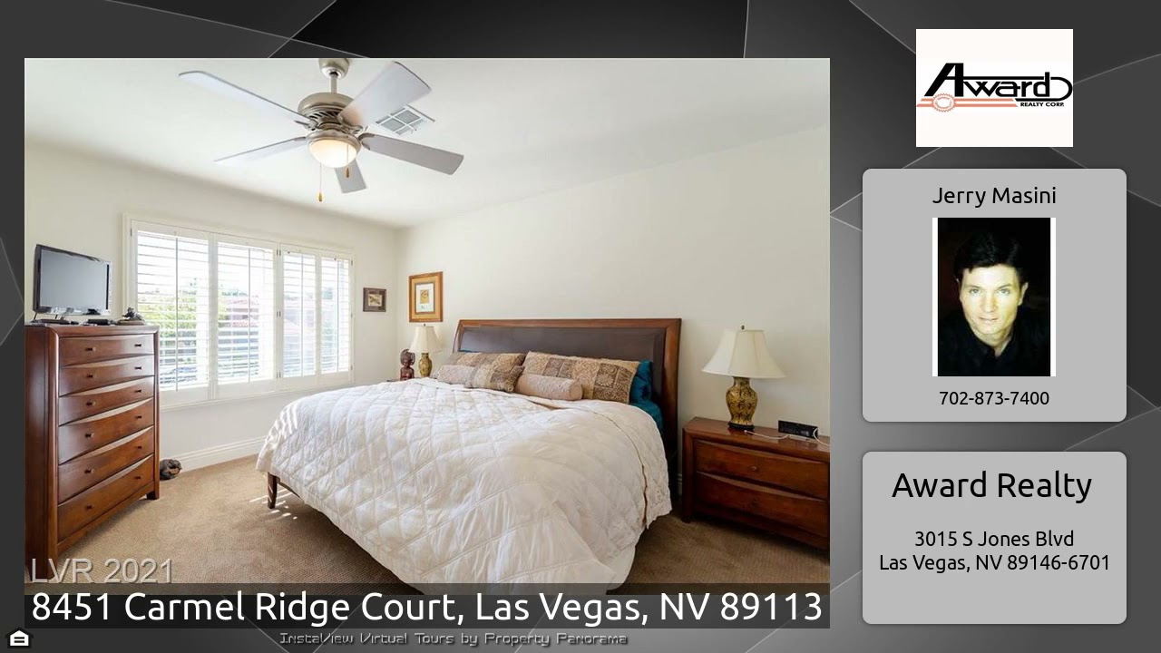 The Virtual Tour for the property at 8451 Carmel Ridge Court, Las Vegas, NV 89113 listed for $850,000: Other homes for sale by Jerry Masini of Award Realty: Remodeled Home In Cul De Sac On Oversized .23 Acre Lushly Landscaped Lot No Home On Either Side. Large Pool Raised Spa Bbq Island. Updated Baths. 3/4 Bath Down. 2 Story Volume Living Room. Separate Dining Room. Spiral Staircase. Custom Lighting. Gourmet Kitchen Features Blue Star French Oven, 6 Gas Burner Cooktop, Sub Zero, Extended Custom Cabinets, Built In Bookcase, Added Breakfast Bar, Granite And Opens To Family Room With Fireplace. …
