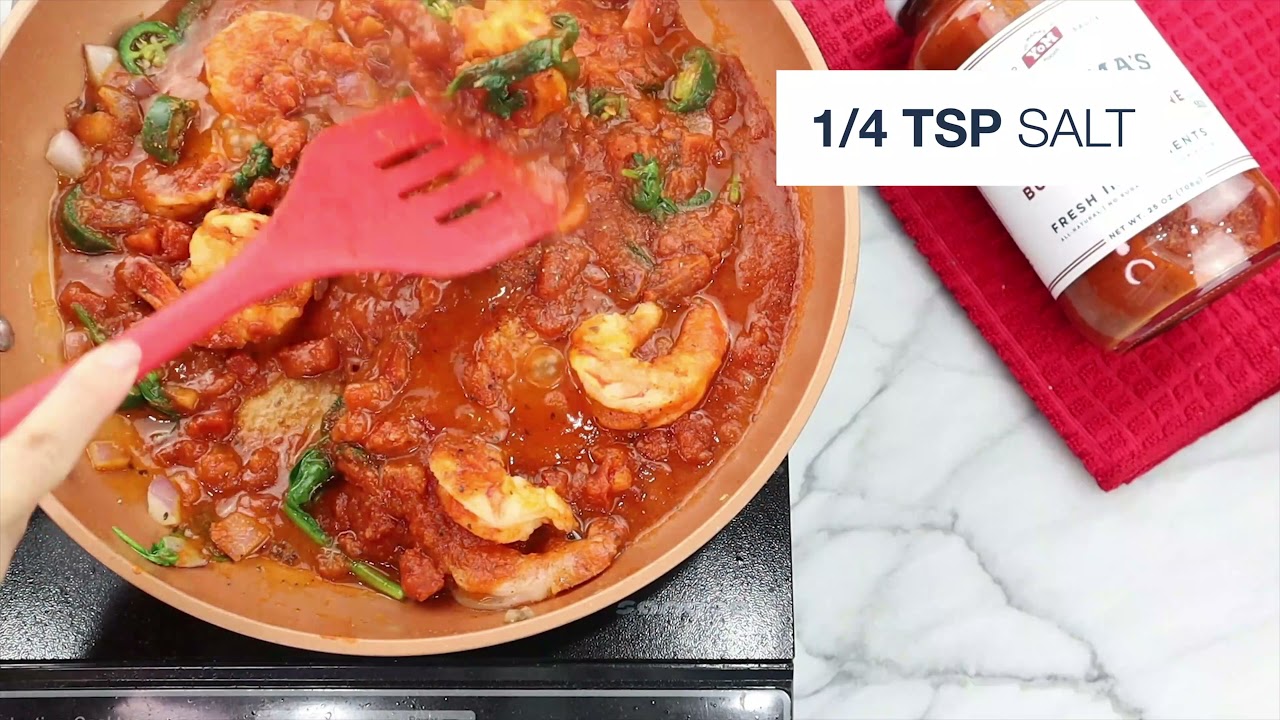 Once the shrimp is almost fully cooked, add in 1 jar of Yo Mama’s Burgundy Wine sauce