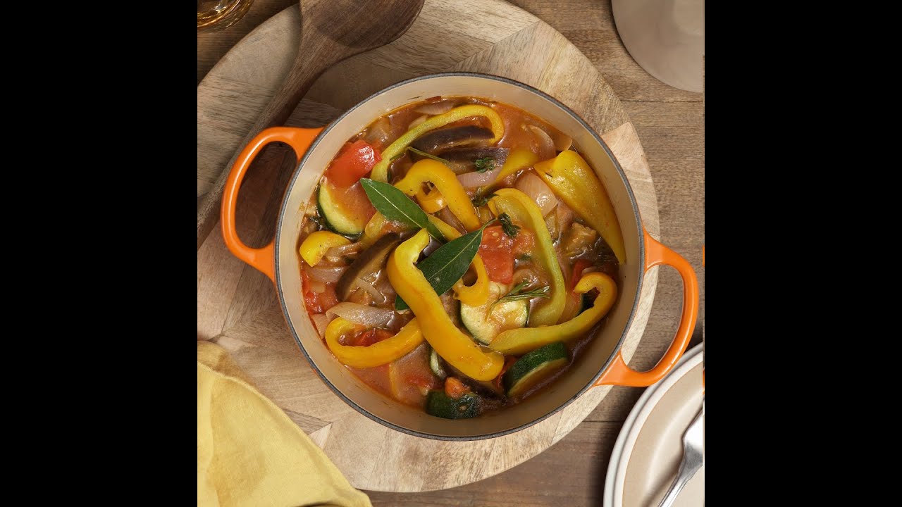 Ratatouille is a vegetable dish from the South of France, especially the Nice region. It contains eggplants, tomatoes, zucchini, onions, bell peppers and garlic. Each vegetable is first cooked until it is soft and sweet. A real treat!