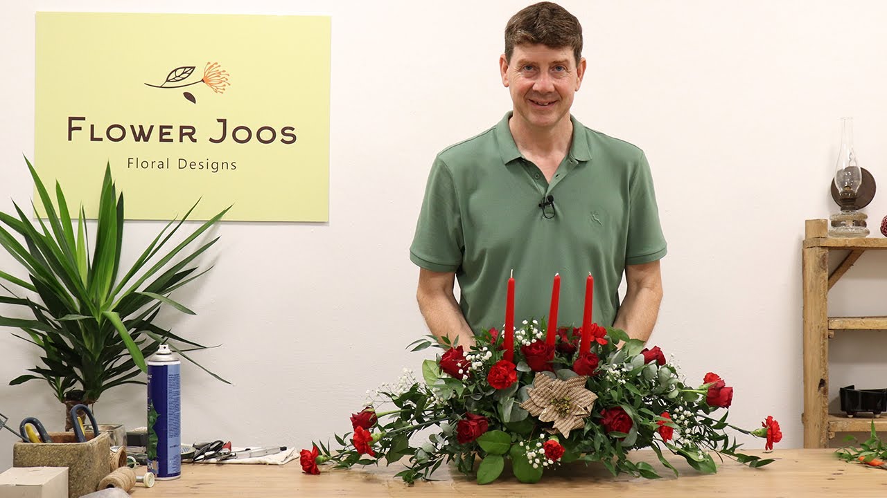 Flowers for the table really complete a setting at Christmas and this design featuring red candles is just perfect as it is one piece – so easily moved if needed to put the food there! We show you how to approach this design, and for all we have chosen tradition colours, you could do an all white version or even a spring, summer or autumn version if you can’t wait until Christmas!