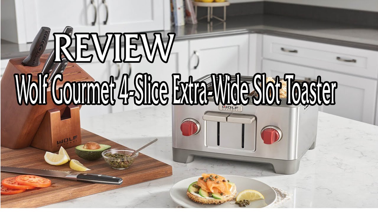 Wolf Gourmet 4-Slice Extra-Wide Slot Toaster with Shade Selector, Bagel and Defrost Settings, Red Knob, Stainless Steel (WGTR104S)