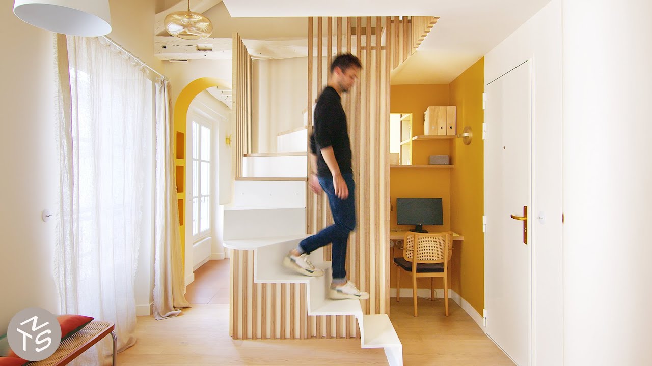 Once an uninhabited and dirty attic space, Villa Saint-Michel was transformed by Nicolas Bossard into a bright, compact and fluid space with a combination of earthy tones and playful colours. After modifying and reinforcing the structure, Bossard added a separation wall, an attic and a feature floating birchwood staircase, designed to take up minimal floorspace. On one side of the staircase is a neatly tucked away small home office with a mustard coloured wall and on the other a luminous yellow archway leads to the surprisingly large stand alone kitchen. The living room, with its feature burgundy wall, birchwood shelves and fireplace is designed to maximise comfort, whilst the ashwood dining chairs and linen curtains all combine to create the Scandinavian beach-side cabin feel that the client envisaged.