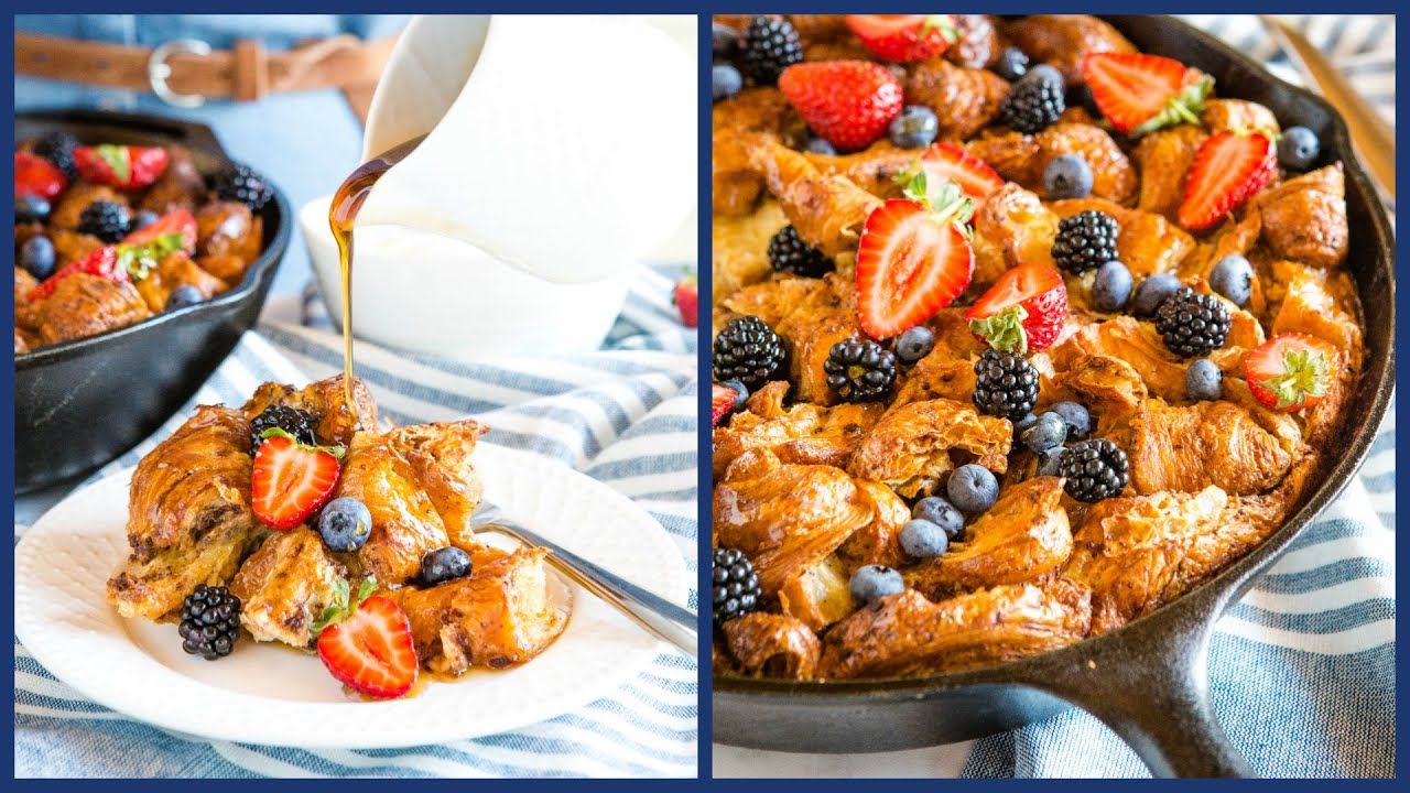 This Skillet Croissant French Toast Casserole is the best easy holiday one-pan breakfast for a crowd! Serve it with maple syrup and fresh berries for a sweet breakfast or brunch treat!