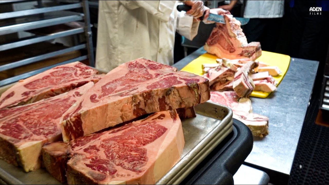 USDA Prime Porterhouse Steak in a Steakhouse in Manhattan, New York City: served with spinach, mashed potatoes and red wine. CityFranceFrenchFrench GourmetgourmetPorterhousesteaksteakhouseVideoVlogYorkYouTube