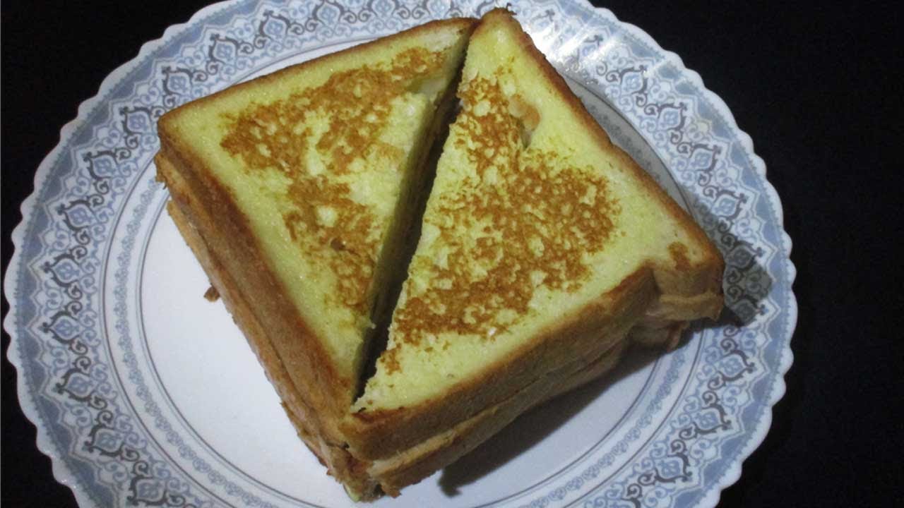 Heat the pan and pour in 10 ml of oil. Put in 15 shallots, 25 gms of ginger and 25 gms of garlic and saute thoroughly. Put in 150 gms of Eggplant pieces which were soaked in water for 2 hours. Add the pieces of one tomato and saute well. Add the pieces of one peeled potato and mix well. Add salt to taste, half a spoon of chili powder and a spoon of mixture of spices and mix well. Add 100 ml of water and mix and let the mixture cook for 10 minutes in the pressure cooker. After the required cooking time mash the potato and the Eggplant . Take 4 slices of bread and apply the mixture of the potato and the Eggplant onto the bread and cover it with another bread slice. Break in an egg into a bowl and add salt and mix well. Heat a pan and pour in 15 ml of oil. spread the oil evenly in the pan and let it become hot. Dip the sandwiches in the egg mixture and put it in the pan and fry for 45 seconds on each side before turning to the other side. Do this for a total of three minutes or till the sandwich turns golden brown. Take off the pan and serve