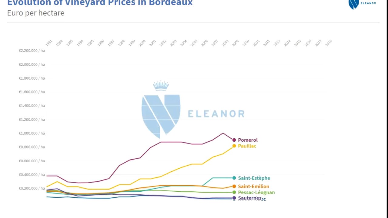This chart shows the price evolution of the vineyard prices in the top Bordeaux appellations: