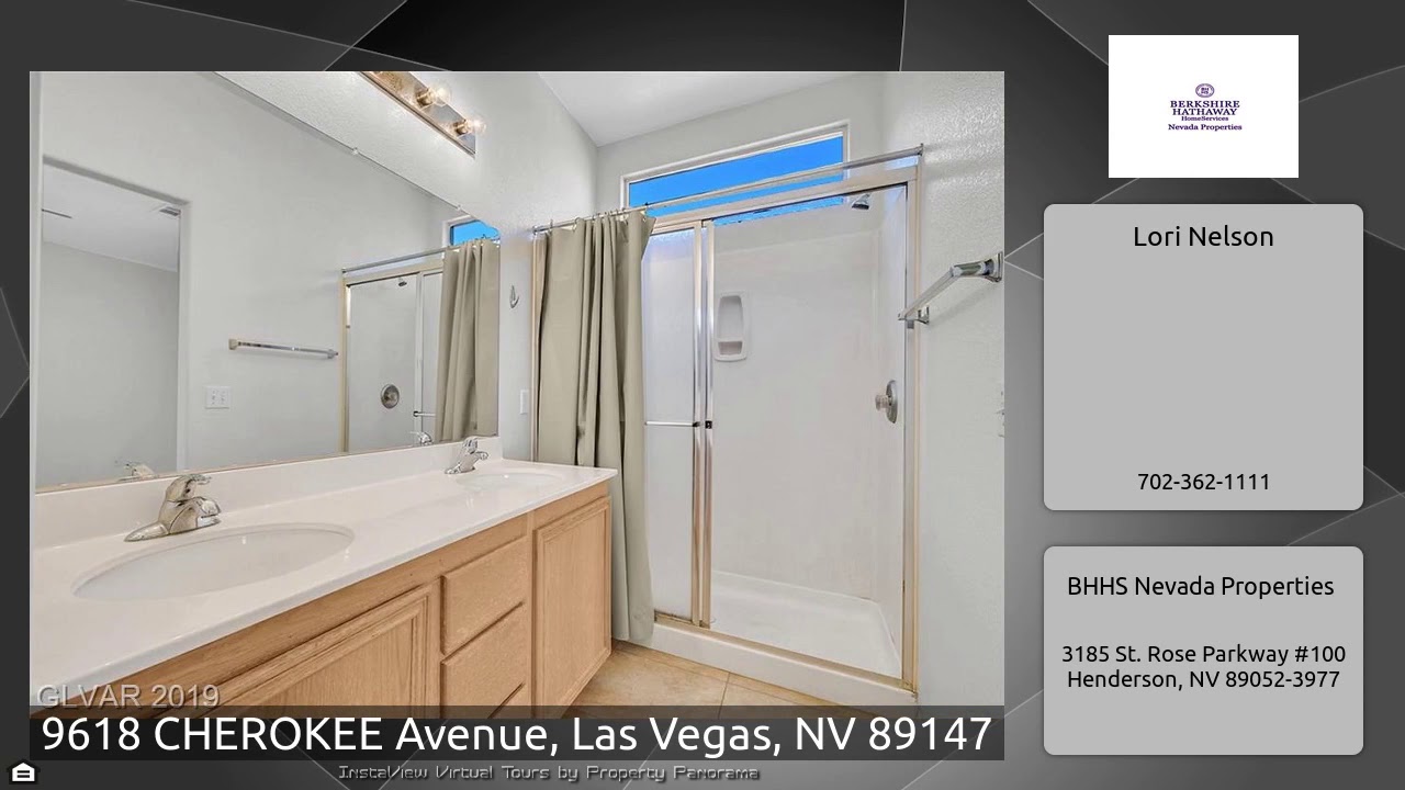 The Virtual Tour for the property at 9618 CHEROKEE Avenue, Las Vegas, NV 89147 listed for $315,000: Other homes for sale by Lori Nelson of BHHS Nevada Properties: PRICE REDUCED!-Single story 1602 sq ft tile throughout, 3 bed/2 bath home is move in ready!Relax on the front porch enjoying this gorgeous neighborhood with NO HOA fees! This home is great for entertaining w/formal living/dining room area and family room. 2nd bedroom has french doors! Masterbath has brand new toilet. All appliances are included. Home is located near schools,shopping and the 215 with an amazing view of the mountains.