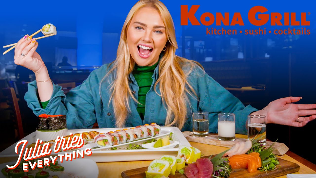 Julia is trying the most popular sushi, cocktails, entrees, and desserts at Kona Grill.
