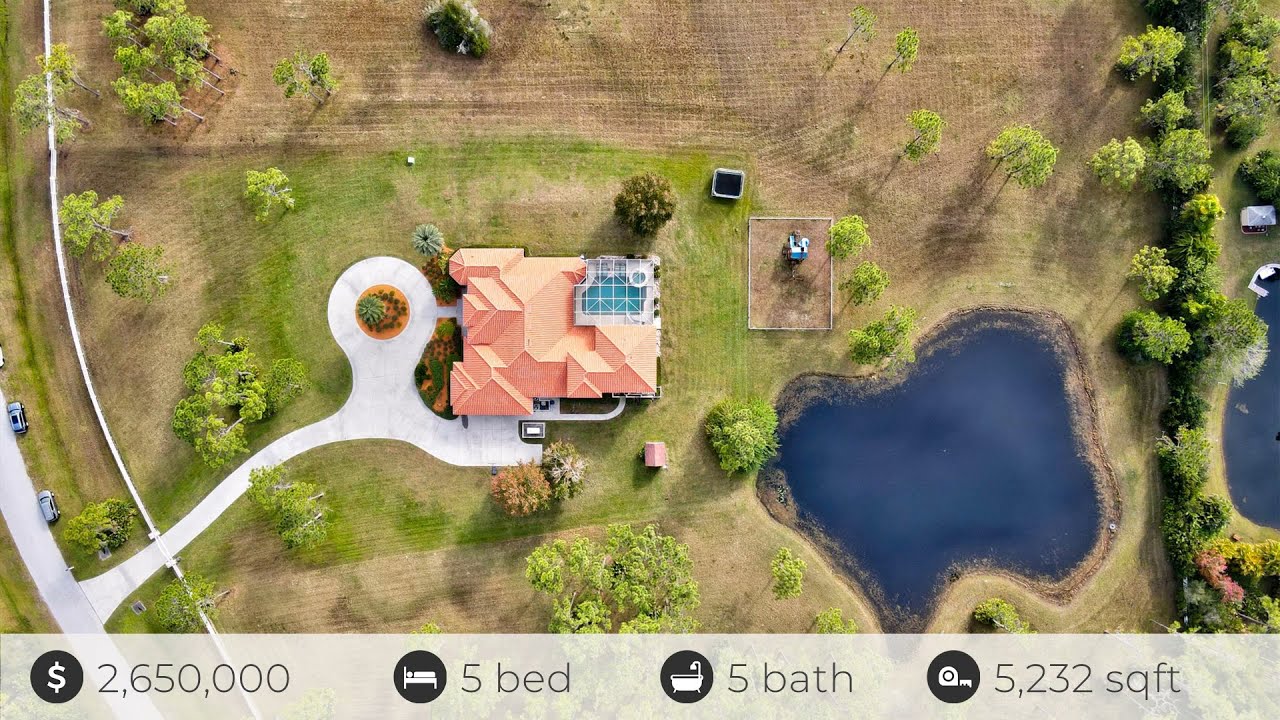 Panther Ridge is a planned and deed-restricted equestrian community that offers the best of country living with easy access to everything Florida has to offer! Close proximity to premier golf courses such as The Concession & Ritz-Carlton Golf Club, upscale shopping, A-rated schools and world-renowned, white, sandy beaches. In addition, this breathtaking, equestrian neighborhood offers over 15 miles of groomed horse and hiking trails with all the conveniences 5 minutes away. Take one look at this custom-built, 6.73-acre estate, and you’ve found your new home. Marvel at the pristine, gated entrance and circular drive as you enter the expansive lot. This acreage provides a perfect haven to kick back and enjoy the peaceful privacy of the surrounding woods or cast a line in your own stocked pond all year round. The kids will love playing with their pets and friends or riding ATV’s on this private property. And it just gets better from here! The arched entrance warmly welcomes you through solid double entry doors into 12-foot ceilings throughout that yawn overhead as you walk through the foyer and into the spacious open-concept floor plan. The living room, with elegant gas fireplace, is a perfect place to have large gatherings and shares a wet bar with the gourmet kitchen. Perfect for entertaining, bartend your party while watching your guests frolic in the sparkling, heated pool and built-in hot tub. Are you an amateur chef? You’ll love the gourmet kitchen: stainless steel double ovens, granite countertops and island, solid maple wood-raised cabinets, breakfast bar, and spacious walk-in pantry. But it doesn’t stop there! Does COVID have you working from home? We’ve got you covered. A large home office with beautiful hardwood floors, French doors, and custom built-ins make your day easy and with room to spare! Head to the cavernous Master suite to bask in the serenity of gorgeous, wooded scenery as Florida sunshine streams through the oversized bay window. Enjoy some “you time” in the Master bath’s whirlpool or oversized, separate walk-in shower with double vanities. Two walk-in closets with California built-ins offer more than enough storage space for everyone. The main level also offers three additional oversized bedrooms with three full baths, as well as an extra-large laundry room. The family room, enhanced with a custom-built entertainment center, opens to the crystal pool for true indoor/outdoor Florida living to include two lanais with a Lynx outdoor grill. Head to the second level and you’ll find a secluded guest suite, huge game room, and a spacious balcony that overlooks the estate’s mature acreage. It’s even hurricane-ready with a whole house generator. This is a perfect Florida retreat in a pristine equestrian community!