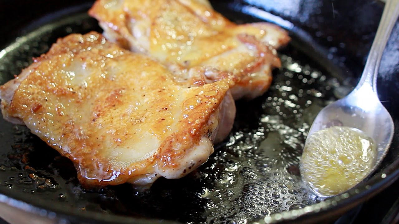 Once hot place chicken skin side down. Allow it to crisp up and become golden brown.