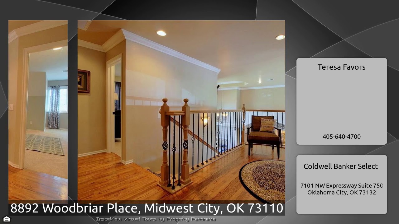 The Virtual Tour for the property at 8892 Woodbriar Place, Midwest City, OK 73110 listed for $435,000: Other homes for sale by Teresa Favors of Coldwell Banker Select: STUNNING HOME WITH GATED ENTRY. Perfect for entertaining with Cathedral ceilings, open living, beautiful kitchen with granite countertops, stainless steel appliances and much more. Wine closet, office with lots of storage, plantation shutters, automatic door shades on French doors leading out to the stunning pool area. Gorgeous landscaping with beautiful golf course view. New paint, carpet and new garage doors also. Over sized …