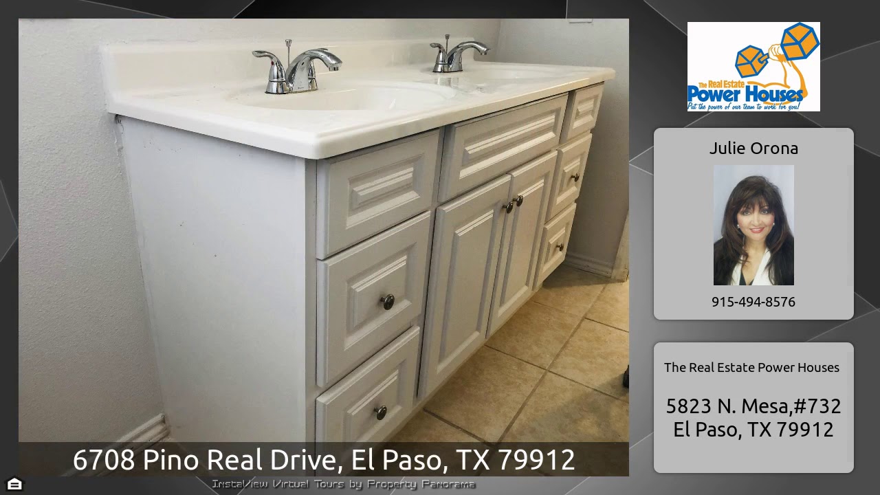 The Virtual Tour for the property at 6708 Pino Real Drive, El Paso, TX 79912 listed for $174,900: Other homes for sale by Julie Orona of The Real Estate Power Houses: Lovely Remodeled Spacious Four Bedroom Home on a Elevated & Shaded Verdant Lot. Ample bedrooms with wood floors. Ceramic tile throughout busy areas . Full Bath all tiled back splash &, Master Bath has Large Double sized Shower Stall Big Tiles throughout with Double vanities.,Open large living room & Separate Dining area w/Plantation Shutters, High Beamed Ceiling with Stone Tiled Fireplace & French doors to the tiled covered …