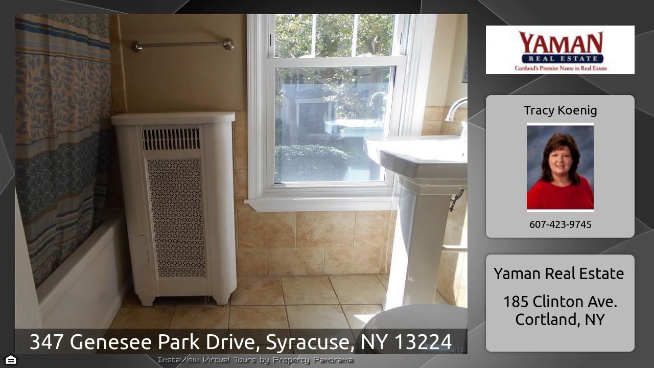 The Virtual Tour for the property at 347 Genesee Park Drive, Syracuse, NY 13224 listed for $149,900: Other homes for sale by Tracy Koenig of Yaman Real Estate: Beautiful, all brick Colonial on a quiet street, featuring hardwood floors throughout and natural light! Enjoy the eat-in kitchen or dine in the formal dining room that leads out onto a lovely, enclosed sun porch. Stay cozy by the fireplace in the large living room, with two sets of French doors, that lead to the front porch w/ wrought iron railing. The natural woodwork staircase takes you upstairs to the three bedrooms also including …