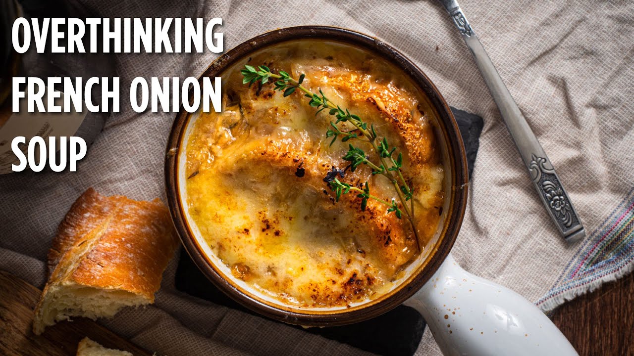 This French Onion Soup features heavily caramelized onions swimming in a rich broth topped with a lid of soup-soaked crostini and gooey gruyere cheese.