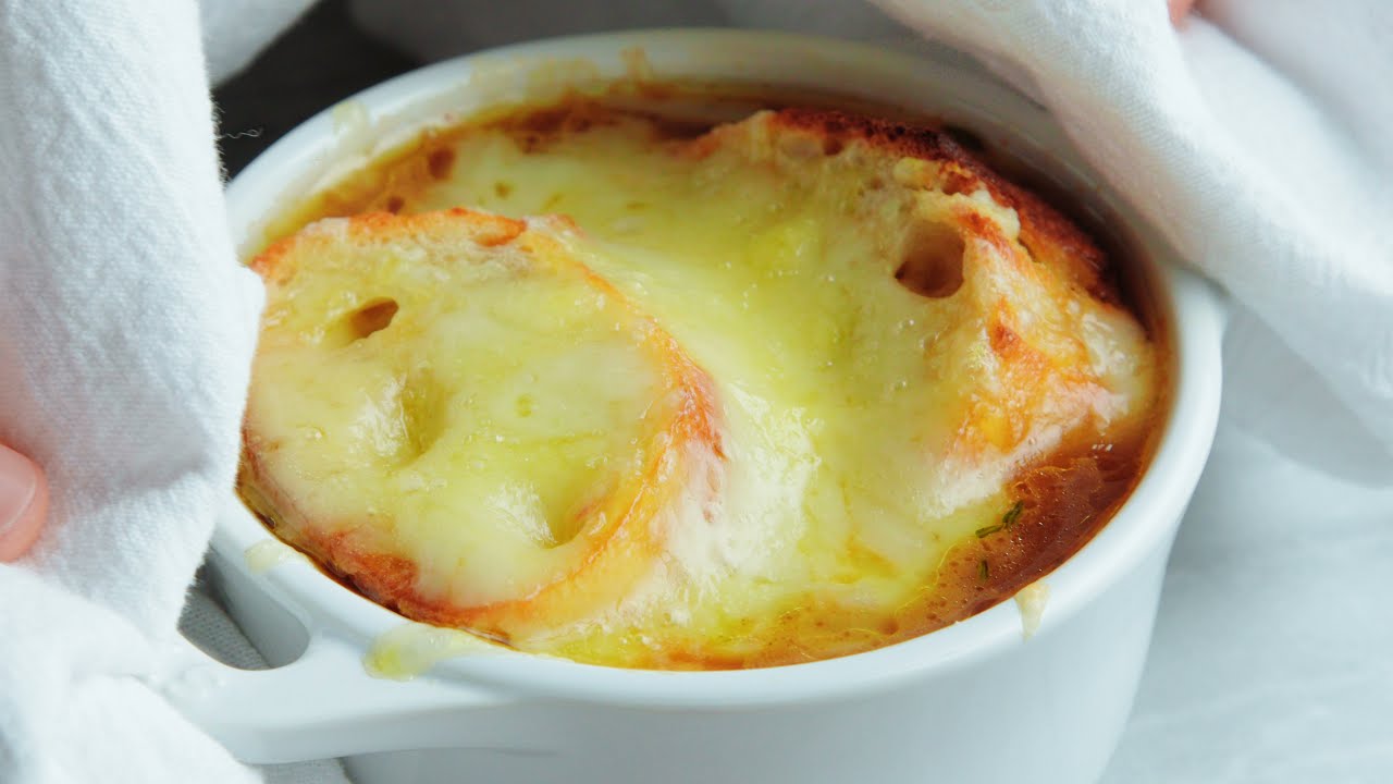 Classic French Onion Soup – Made with perfectly caramelized onions, fresh thyme sprigs, crusty baguette slices and two types of melted cheese right on top!