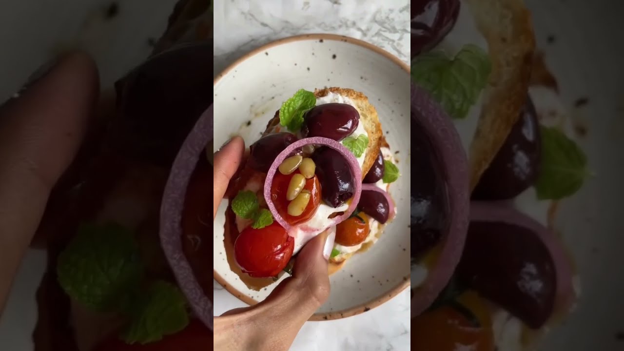 Here I’ve made a roasted tomato and kalamata olive confit served on fresh French bread over a spiced yogurt labneh , topped with pine nuts, pickled onions and mint…does it get any better? I don’t think so!!
