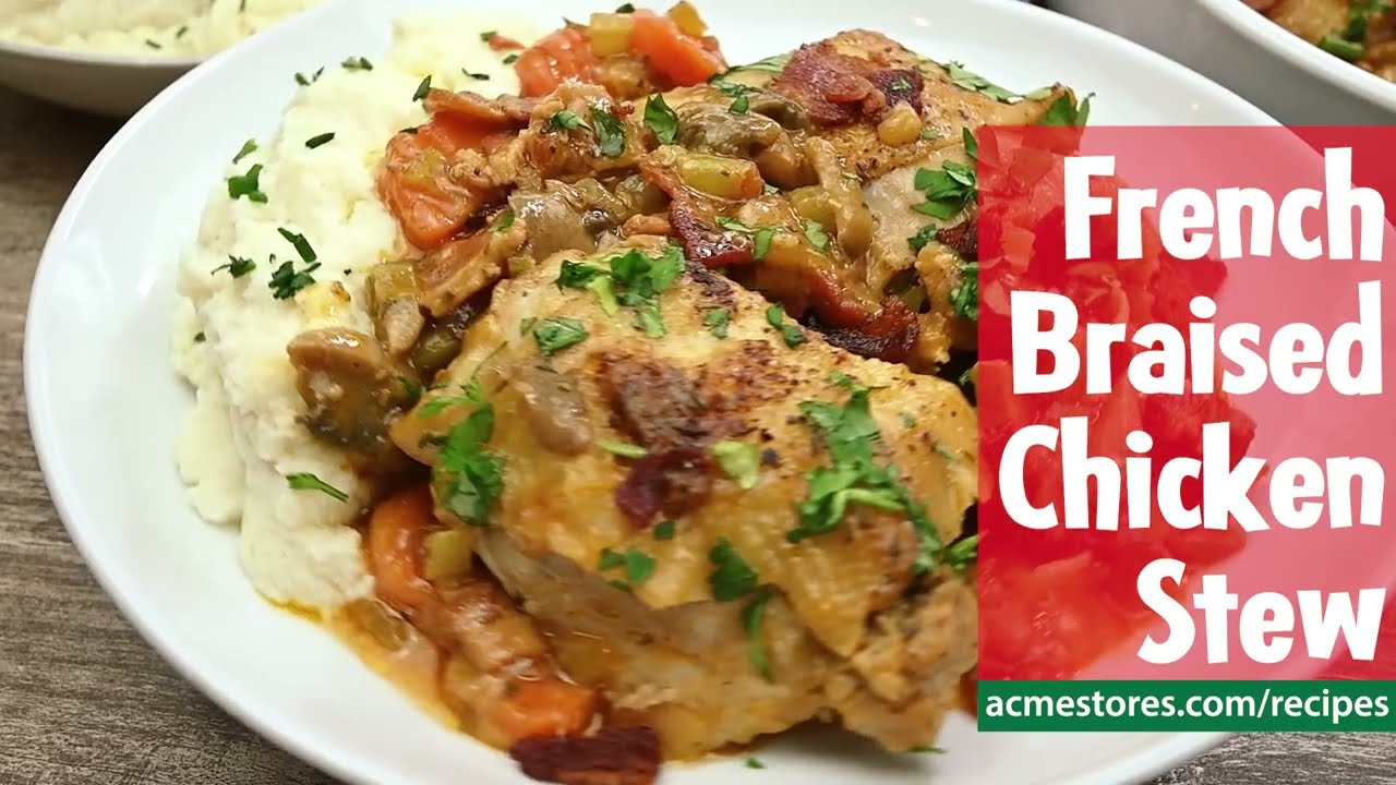 Our French Braised Chicken Stew is a quick and easy take on the classic French Coq no Vin dish made inexpensively with Acme brand ingredients and without alcohol. Perfect dish for those doing Whole30, Paleo, Gluten-Free (adaptation included), Dairy-Free, and Grain-Free diets. Serve with cauliflower mash (pictured above), mashed potatoes, or rice.