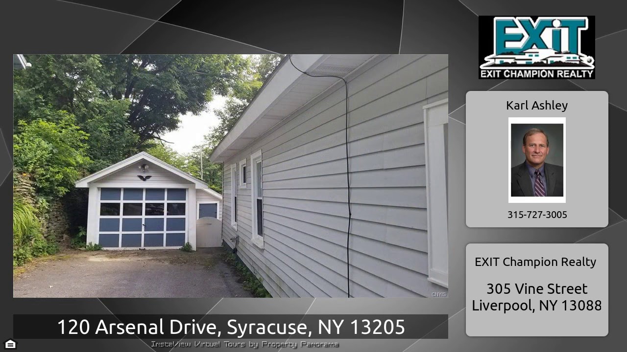 The Virtual Tour for the property at 120 Arsenal Drive, Syracuse, NY 13205 listed for $73,900: Other homes for sale by Karl Ashley of EXIT Champion Realty: Valley Oasis on Cul-de-Sac, Bonus enormous Private Yard!!, maintenance free siding, Vinyl Windows, Newer High efficiency Furnace, Good Sized Living Dining Combo with Fireplace and French doors opening to front Porch, Eat-in Kitchen, Full Basement with Laundry, washer and dryer stay. 3bedrooms all on 1 level.