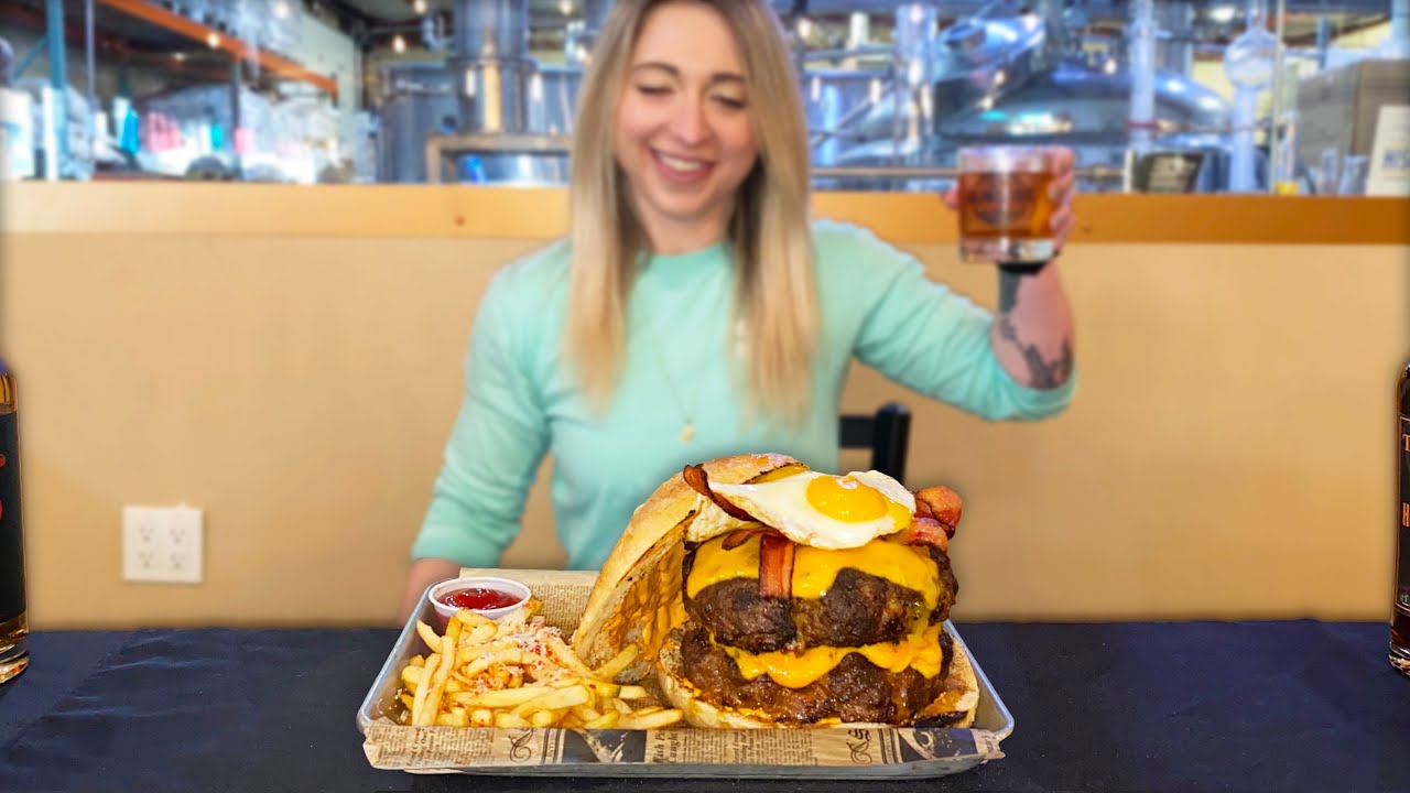 Taking on the 50/50 Belly Buster Burger Challenge from Hollow Spirits Distillery in Albuquerque, New Mexico! Challengers have 1 hour to finish two – 2 pound half chorizo/half brisket and short rib burger patties, each covered in 6 slices of cheese, bacon, and eggs sandwiched between a full loaf of fresh baked rosemary sourdough, along with a side of their bacon-parmesan fries! Winners receive the $98 meal for free, a groovy t-shirt, and a spot up on the distillery’s brand new Wall of Fame!