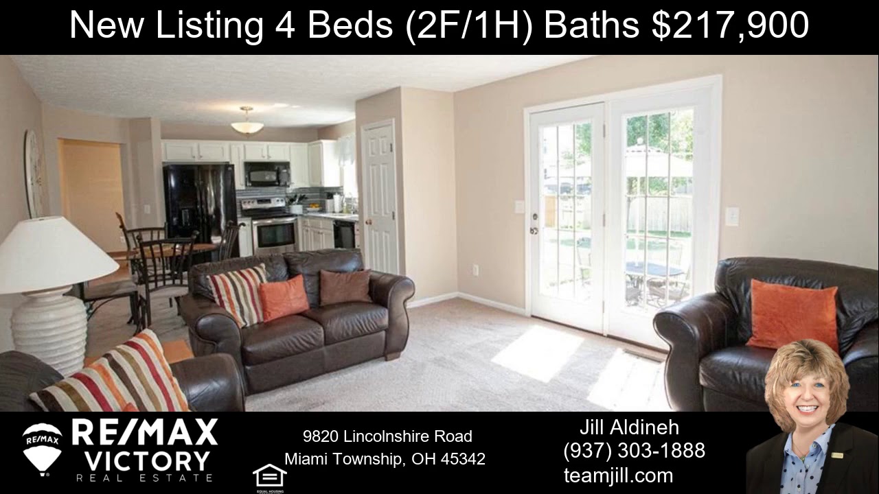New Listing 4 Beds (2F/1H) Baths $217,900 ❤️❤️❤️🏠🏠🏠🔑🚪 9820 Lincolnshire Road, Miami Township, OH 45342 for showings call 👉 #JillAldineh 👈 #REMAXVictory ☎️(937) 303-1888. 2 story brick contemporary on quiet street w/great curb appeal. New carpet & freshly painted throughout. Ceramic tile in entryway, kitchen & baths. Formal living & dining rooms. Renovated eat-in kitchen has beautiful cabinets, granite countertops, glass tile backsplash, matching appliances & pantry. Laundry room & 1/2 bath conveniently located on main level. Family room has french doors leading to private backyard w/paver patio-perfect for outdoor dining/relaxing. 2nd level has 4 bedrooms (one w/walk-in closet) and full bath w/new floor tile. Owner suite has totally renovated full bath & 2 closets (one walk-in). Unfinished lower level provides plenty of storage & potential living space. New HVAC system, new water heater (2019) & newer water softener system. 2 car attached garage. This lovely home is immaculate & move in ready…it wont last long so come and take a look! ❤️❤️❤️🏠🏠🏠🔑🚪 9820 Lincolnshire Road, Miami Township, OH 45342 for showings call ❤️❤️❤️🏠🏠🏠🔑🚪