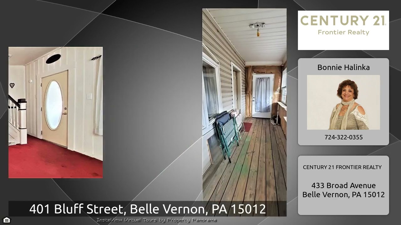 The Virtual Tour for the property at 401 Bluff Street, Belle Vernon, PA 15012 listed for $79,900: Other homes for sale by Bonnie Halinka of CENTURY 21 FRONTIER REALTY: This 2 story home has a white galley kitchen that is fully applianced & an open floorplan to the dining room. There are french doors to the deck. Take a stroll to the sunken livingroom. The owner started enclosing the porch, just a few finishing touches to complete it. The laundry and half bath are on the 1st floor. How convenient. Upstairs are 2 bedrooms and a captive 3rd. The 3rd bedroom is set up as a sitting room, but can but …