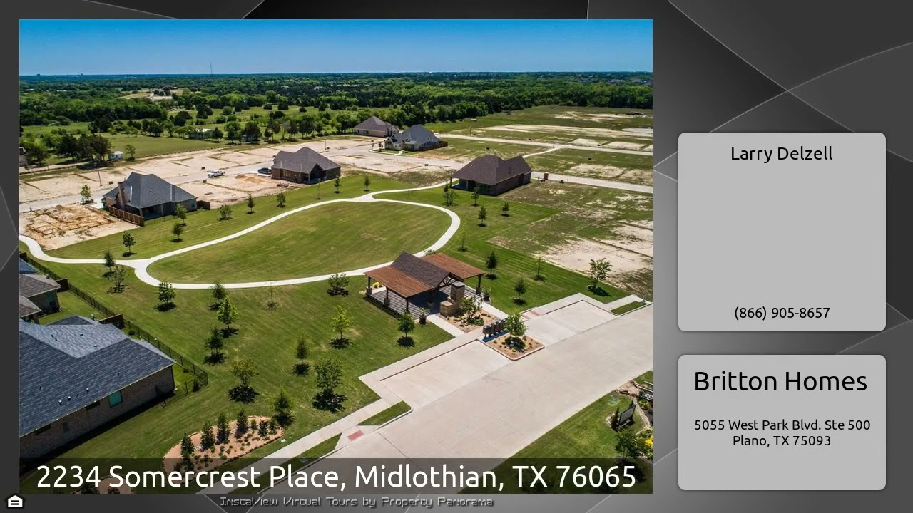 The Virtual Tour for the property at 2234 Somercrest Place, Midlothian, TX 76065 listed for $556,900: Other homes for sale by Larry Delzell of Britton Homes: PERRY HOMES NEW CONSTRUCTION! Extended entry with 12-foot ceiling. Home office with French doors. Large utility room. Game room with French doors. Kitchen features an island with built-in seating space and corner walk-in pantry. Dining area with wall of windows. Open family room with wall of windows and a wood mantel fireplace. Secluded primary suite. Double door entry to primary bath with dual vanities, garden tub, separate glass- …