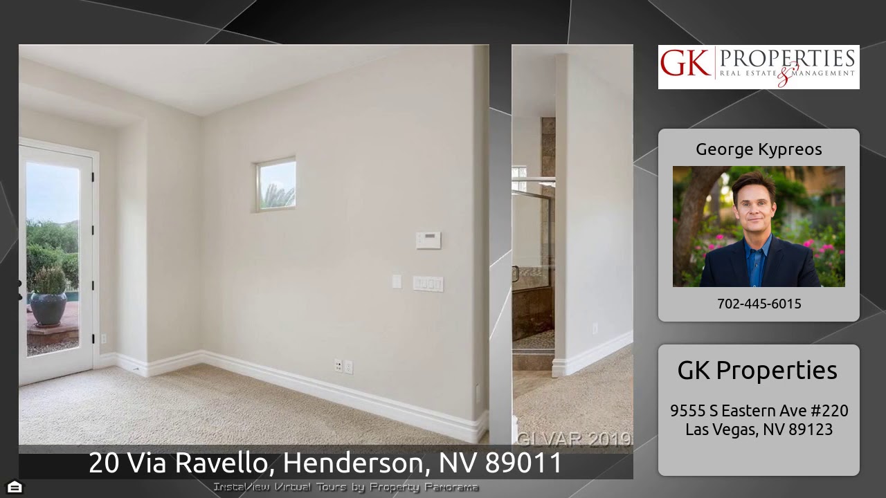 The Virtual Tour for the property at 20 Via Ravello, Henderson, NV 89011 listed for $559,900: Other homes for sale by George Kypreos of GK Properties: Impeccable 1-STORY 3BDRs, 3.5BTHs & Den in prestigious Lake Las Vegas! Amazing curb appeal w/unique façade & courtyard. Bright Family Rm w/cozy fireplace & joined Dining area. Expensive ambiance w/French doors, crown molding, gorgeous tile flooring & fixtures. Kitchen w/granite cnts & backsplash & high-end SS appls. All BDRs w/private luxurious BTHs. Backyard oasis w/sparkling POOL, firepit, builtin BBQ, covered patio, golf course & mountain view