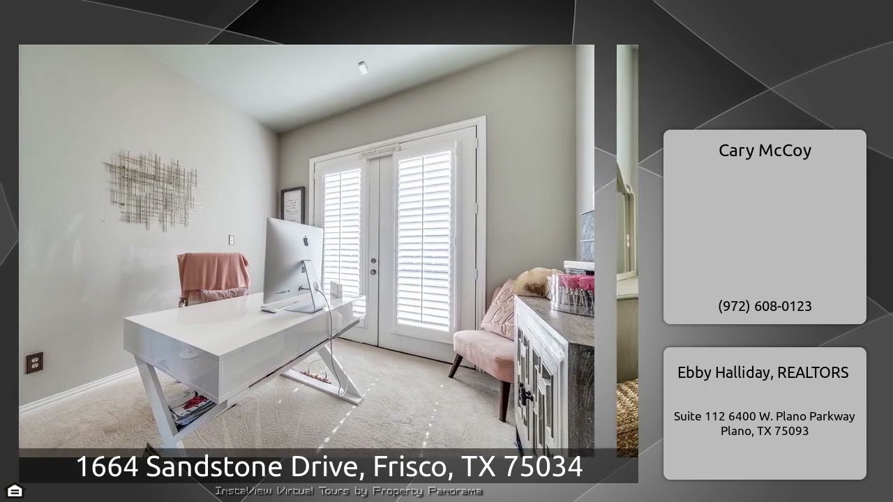 The Virtual Tour for the property at 1664 Sandstone Drive, Frisco, TX 75034 listed for $995,000: Other homes for sale by Cary McCoy of Ebby Halliday, REALTORS: ****HIGHEST AND BEST BY 8PM SUNDAY JAN 23*******Elegant and pristine home with stunning backyard oasis featuring pool and spa in this secluded neighborhood! Fabulous floorplan features 5 oversized bedrooms, Study w-french doors, Game Room w-wet bar, Media Room w-Balcony, all with custom lighting and paint. Beautiful hand-scraped hardwood floors, Dramatic ceilings, & and wall of windows! Gourmet kitchen has bright white cabinets, …