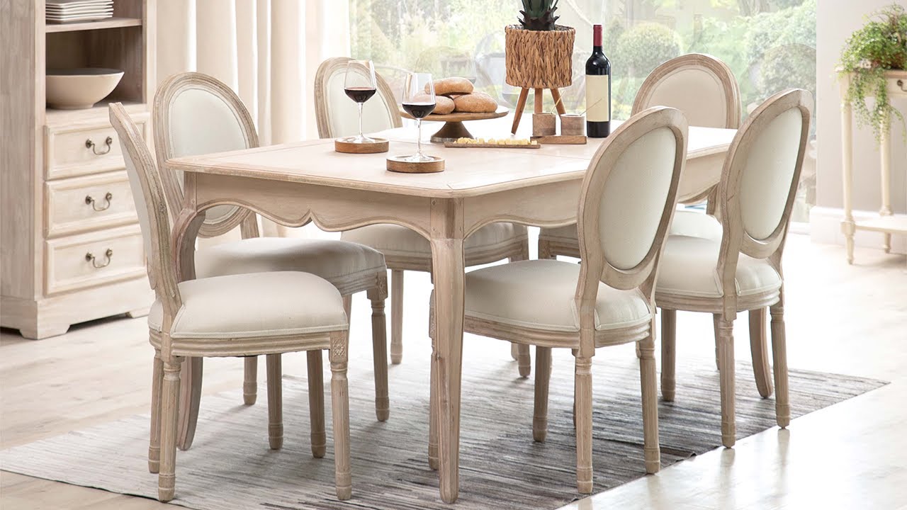 Be inspired by this quintessentially French dining set, featuring the classic Olivia Dining Chairs paired with the elegant Moroso Dining Table. This combination is the epitome of calm, old-world elegance. Featuring a solid wood table and chairs with carving detailing and a washed finish.