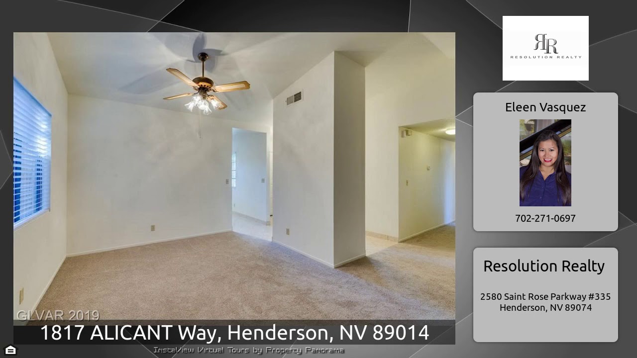 The Virtual Tour for the property at 1817 ALICANT Way, Henderson, NV 89014 listed for $299,990: Other homes for sale by Eleen Vasquez of Resolution Realty: Charming and cozy single-story home in Green Valley with 3 bedrooms, new carpet, and new paint, and a beautiful front yard. Well-appointed kitchen with breakfast nook. Open concept dining and family room with gas fireplace and vaulted ceilings. French doors lead to extended Sunroom (15X14) and to the spa and backyard, great for entertaining.