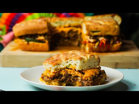 Today we’re putting our twist on a pork filled Mexican favourite, as we show you how to make a giant cheesy carnitas sandwich, perfect for sharing!